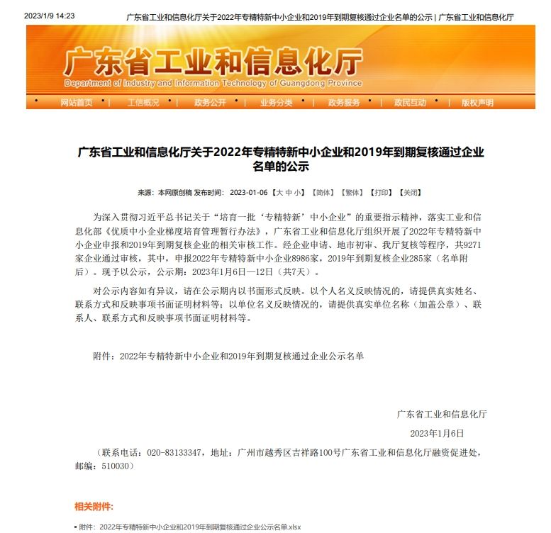 凭证广东省工业和信息化厅近期宣布的《广东省工业和信息化厅关于2022年专精特新中小企业和2019年到期复核通过企业名单的公示》,我公司被评定为广东省“专精特新”中小企业企业。