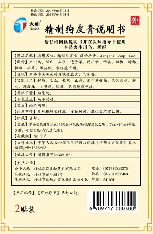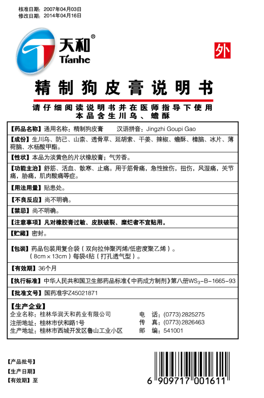 <dt>药品名称</dt><dd>精制狗皮膏</dd>